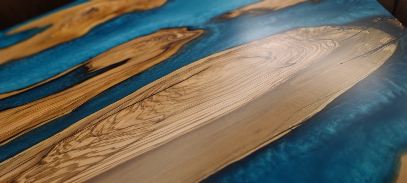Vernissage Guillem a réalisé l'application de vernis extramat anti rayures sur une table en bois d'olivier et en résine époxy.
